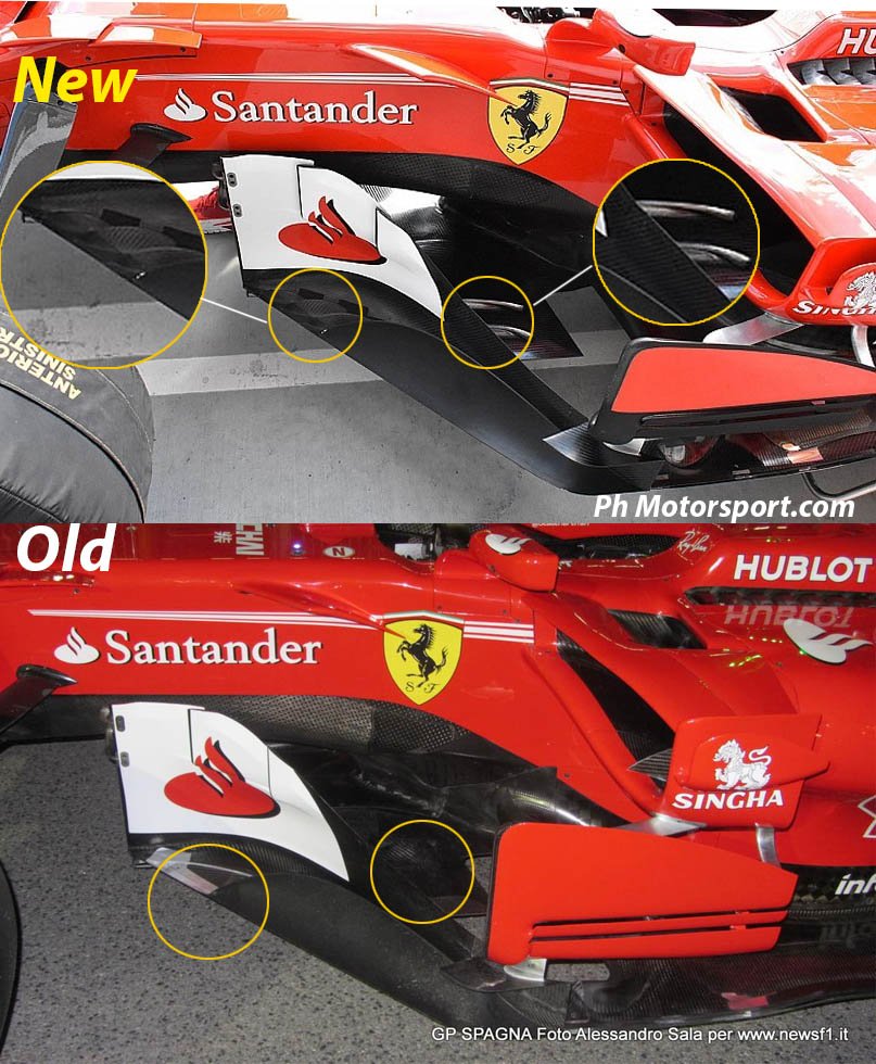 Per l’Ungheria la squadra di tecnici capitanata dal direttore Mattia Binotto e dal responsabile dell’aerodinamica Enrico Cardile, posizionato a capo del progetto SF70-H a partire dall’estate scorsa, ha studiato alcune importanti soluzioni circoscritte all’area del bargeboard e del fondo piatto aventi lo scopo di convogliare un maggior flusso d’aria nella zona del diffusore posteriore, in seguito alla decisione di vincolare con supporti metallici il coltello nella zona laterale del fondo, dopo che l’elemento sottoposto a notevoli flessioni aveva mostrato che era in grado di generare vortici negativi al corretto funzionamento del fondo piatto. Lo studio sarebbe stato pianificato già da tempo, probabilmente dopo che nei test prestagionali la FIA aveva rivolto alcune perplessità nei riguardi del cosiddetto “coltello”.