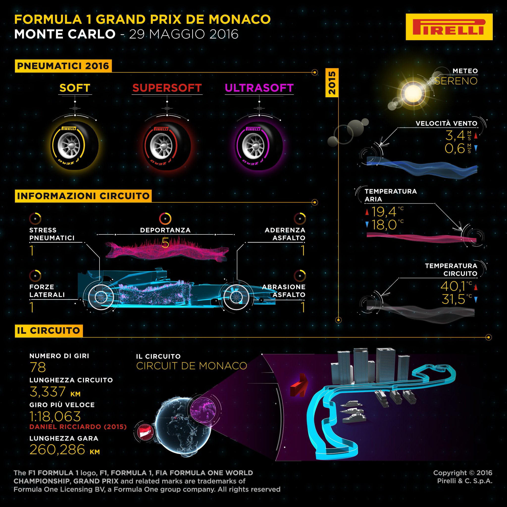 Milano, 23 maggio 2016 – La tanto attesa P Zero Purple ultrasoft fa il suo debutto al GP di Monaco, accanto alla P Zero Red supersoft e alla P Zero Yellow soft: i tre pneumatici più morbidi della gamma. Ideali nelle condizioni di basso grip e basse velocità del circuito cittadino di Montecarlo, dove l’accento è sempre sul grip meccanico dei pneumatici. Montecarlo è un luogo talmente leggendario che c’è poco da aggiungere a quanto non sia già stato detto: resta la gara più prestigiosa in calendario.