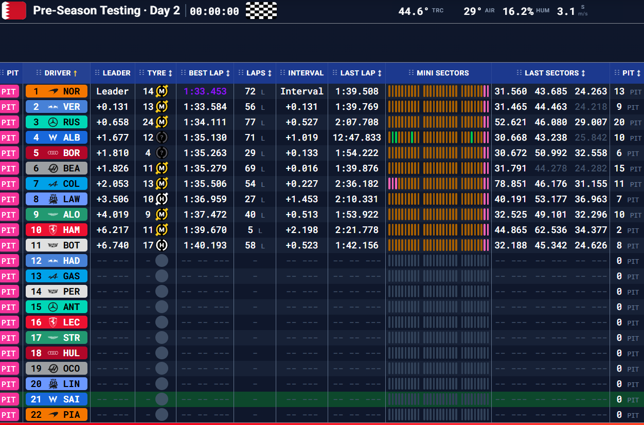 La mattinata del Day 2 al Bahrain International Circuit ha fornito indicazioni più chiare sui valori in campo. Lando Norris ha fermato il cronometro sull’1:33.453, miglior tempo assoluto dell’intera sessione di test 2026, superando di appena sei millesimi il riferimento siglato ieri da George Russell.