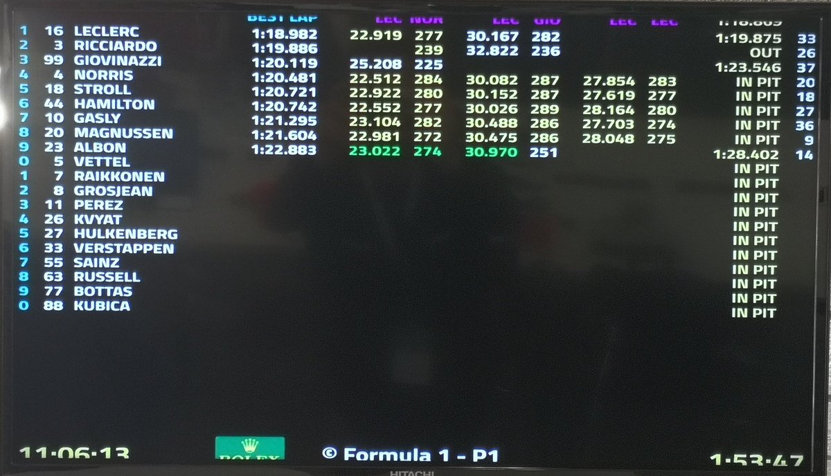 In seconda posizione troviamo la Renault di Daniel Ricciardo, che dopo una giornata anonima ieri ha deciso di spingere maggiormente in mattinata. 1’19”886 con mescola C3 il miglior tempo dell’australiano, che ha all’attivo anche 27 passaggi. Terzo Lewis Hamilton con la Mercedes W10. Il britannico era risultato molto tranquillo nelle prime ore, dando l’impressione di non voler forzare. Poco fa ha montato anche lui la mescola C3 piazzando un buon 1’19”928 che lo tiene ad oltre un secondo da Leclerc con una gomma più morbida. Il campione del mondo ha messo insieme 37 passaggi ed è il più attivo di giornata al momento. Quarto Antonio Giovinazzi con l’Alfa Romeo Racing, che è risultato uno dei piloti più presenti in pista avendo inanellato ben 31 tornate. Il suo 1’20”119 è arrivato a parità di gomma con i due che lo precedono ed il pugliese sta costantemente migliorando i propri tempi.