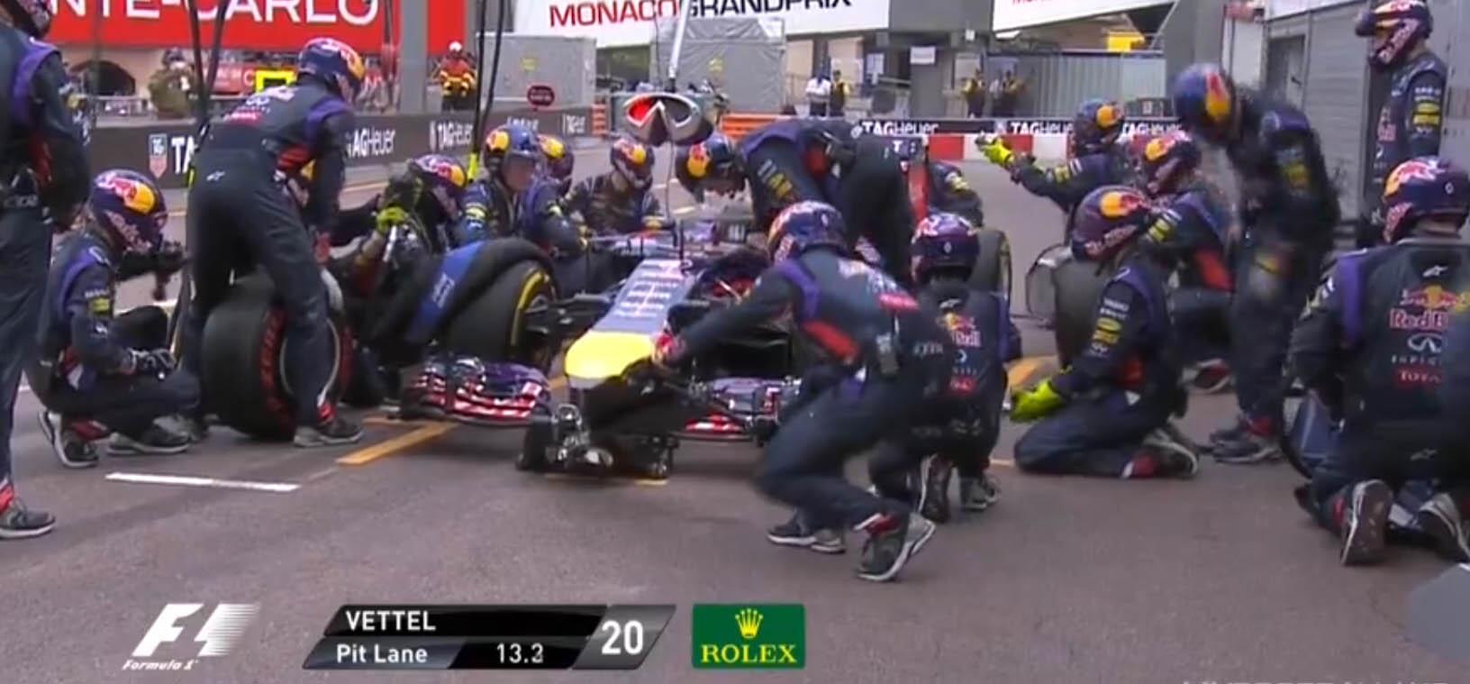 Rosberg si fermava al box per il cambio gomme seguito da tutti gli altri piloti, compresi Kimi e Fernando che impegnavano i ragazzi del box con due soste in sequenza. Al giro 28, tuttavia, Kimi era costretto a rientrare nuovamente in pitlane con una gomma forata, dopo essere stato colpito dalla Marussia di Max Chilton che si stava sdoppiando. Kimi rientrava al 13° posto.