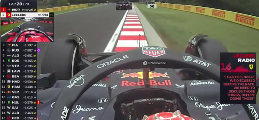 Durante la gara, Leclerc via radio dice: “Mi dovete ascoltare! Così è impossibile fare il podio”. Dopo il GP, insinua che ci fosse una decisione presa senza il suo consenso, forse legata alla pressione degli pneumatici o alla mancata modifica dell’ala anteriore.