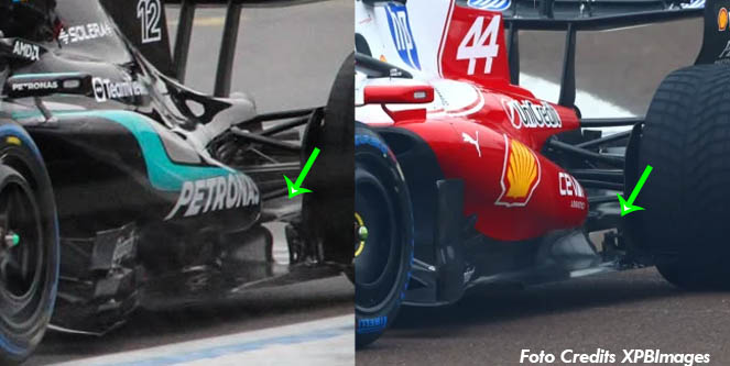 Entrambe le vetture sembrano convergere su soluzioni di sospensione consolidate come il push-rod. Tuttavia, dettagli come i tiranti (stay) dei Bargeboards dietro le ruote anteriori della Ferrari appaiono più generosi rispetto a quelli, apparentemente più fini, della Mercedes.
