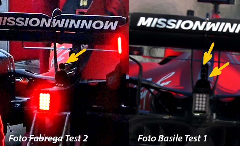 Ferrari conferma la nuova T-Wing molto larga, ma soprattutto, continua lo studio del layout dello scarico posteriore, con una sola uscita wastegate Ferrari, sopra allo scarico principale anzichè due (si può ben notare come il cofano non sia stato adattato a questa versione, avendo ancora lo spazio per lo scarico superiore.