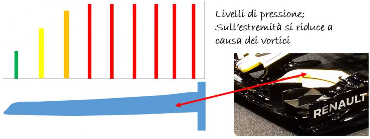 Considerando inoltre che una parte di gas si muove verso aree a pressione minore, è possibile immaginare una riduzione della pressione stessa dal lato dove è più elevata. è come se togliessimo particelle di aria dal lato superiore delle ali di formula 1, dove se ne possono trovare molte, per portarle sul lato inferiore. Cosi facendo, togliendo molecole di aria dal lato superiore, di fatto liberiamo spazio riducendo la pressione. Questo avviene proprio in prossimità dell’estremità, dove si generano i vortici.