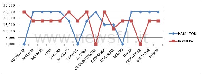 E’ oramai noto che io ho pronosticato, dopo il GP di Montecarlo, Rosberg vincitore del Campionato in corso e questo non perché lo ritengo più forte di Hamilton, ma per due fattori, l’astuzia vera o presunta (vera per me) di quella manovra nel Principato e il fatto che sia Tedesco, conosco bene il nazionalismo dei Teutonici e mi sono sbilanciato pensando che all’interno del Team avrebbero favorito Nico così da vincere un Mondiale con un Pilota di ‘casa’, altri fattori sono stati, la ‘scomparsa’ di Hamilton dagli spot Mercedes e il sontuoso contratto offerto a Rosberg per i prossimi anni, mentre Hamilton non ha ancora rinnovato, la motivazione del mancato rinnovo è quella di lasciare tranquillo il Britannico e non farlo distrarre con carte bollate e discussione di ingaggi più o meno principeschi, ma è tutto qui? Veramente la Mercedes non rinnova per far concentrare il suo Pilota di spicco? In teoria col futuro assicurato dovrebbe esser maggiormente tranquillo e lavorare con più calma invece di dover dimostrare in pista il suo valore; comunque sia i fatti sono questi e potrei essermi sbagliato di brutto visto che il Britannico è avanti in classifica di 17 punti e sembra intenzionato ad aumentare il distacco in quanto ha imboccato una striscia di risultati positivi veramente invidiabile, cosa accadutagli, tra l’altro, anche in un’altra fase della stagione, per rendere meglio l’idea diamo un’occhiata al grafico sotto riportato