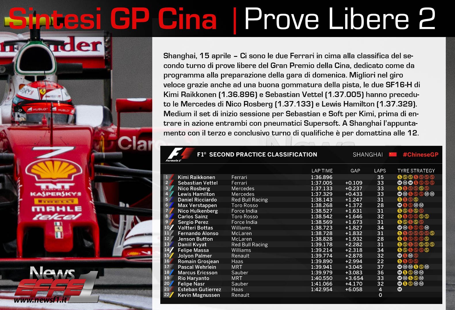 La prestazione comunque c’è, questa Ferrari è sì in grado di battere la Mercedes ma servirà una combinazione di elementi favorevoli per raccogliere il premio grosso. Il passo è parso buono, soprattutto con gomme supersoft, anche se l’incognita sono le temperature: ancora troppo basse e tutti sono in attesa di capire come evolverà il meteo nel corso del weekend. Elemento da considerare sarà anche il graining, emerso in maniera evidente in particolare sulle gomme supersoft in ragione proprio del freddo inaspettato sul tracciato cinese.