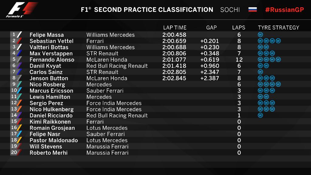 Nella seconda sessione è stata sempre la pioggia, ancora più intensa, a farla da padrone, con soltanto 8 piloti a far segnare almeno un giro cronometrato: a mettersi davanti a tutti ci ha pensato, nell’ultimo tentativo utile, Felipe Massa (un pilota che, in carriera, non ha mai amato particolarmente le condizioni di bagnato estremo), che ha preceduto Vettel (autore di un terzo settore davvero notevole, dopo i primi due intertempi non particolarmente significativi) ed il compagno di squadra Valtteri Bottas.