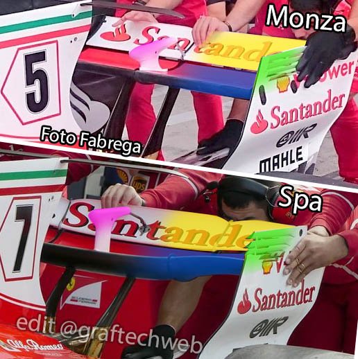 Solitamente le alte velocità permettono di avere ali più “complesse” in quanto l’aria, più energizzata , rimane attaccata ad ali con curvature maggiori. Ma ali complesse ed a cucchiaio servono per spremere più deportanza, che inevitabilmente si porta dietro una maggiore resistenza all’avanzamento,che a Monza, il tempio della velocità, è ciò che si vuole evitare assolutamente. Proprio per questo il team di Maranello porta un’ala scarica, con un bulbo del DRS basso in viola (con una sezione resistente quindi inferiore) e con le soffiature sulle derive molto ridotte in verde. Queste soffiature servono a migliorare l’efficienza dell’ala, portando un carico maggiore ma causando turbolenze che ,a loro volta, causano un maggiore drag (resistenza all’avanzamento). Ferrari sceglie quindi di puntare su un’ala estrema e ” scarichissima” , praticamente inutilizzabile su una pista senza i lunghi rettilinei; d’altro canto ci possiamo aspettare qualche difficoltà, per i piloti del Cavallino, a tenere la vettura in strada, soprattutto in accelerazione. Proprio per questo partire davanti sarà fondamentale in quanto la vettura dei 70 anni non potrà sfruttare in partenza il lungo rettilineo e la scarsa trazione in uscita dalla variante potrebbe permettere alle Mercedes di tentare il colpaccio anche se Seb e Kimi partissero davanti. La situazione ideale sarebbe Vettel al comando e Raikkonen fedele scudiero a proteggerlo, così da tenere a bada l’arrembante Hamilton. Ma prima, bisogna conquistare la pole…
