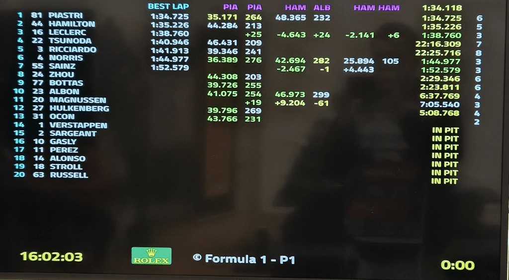 Dopo una pausa di altri 15 minuti, la McLaren ha mandato Oscar Piastri in pista con un set di intermedie, ma anche in questo caso si è trattato solo di un giro di ricognizione, nonostante il pilota abbia comunicato via radio che “non è così bagnato”. Nonostante il rischio di rapido degrado delle gomme con striscia verde in tali condizioni, Zhou Guanyu della Stake, Valtteri Bottas e l’eroe locale Yuki Tsunoda della RB, insieme al compagno di squadra Ricciardo, hanno deciso di uscire. Tsunoda ha persino tentato un giro veloce, registrando un tempo di 1:42.304s, 12.3 secondi più lento rispetto al tempo migliore di Max Verstappen nelle FP1.