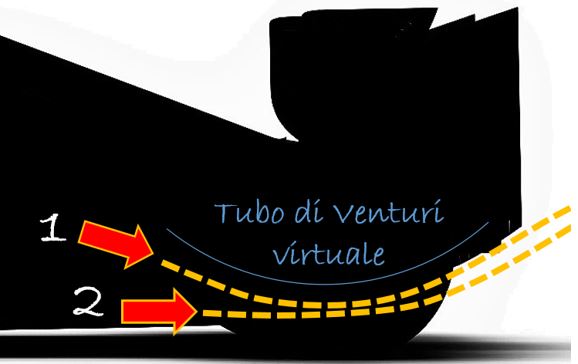 Nonostante la differenza tra le due configurazioni, esiste un punto in comune e, proprio per questo, ho inserito nello schema la rappresentazione del tubo di Venturi virtuale (virtuale per dire che non è una vera e propria superficie presente sulle auto, ma la traiettoria dei flussi attorno alla vettura, in base a come agiscono i componenti aerodinamici dell’auto stessa)