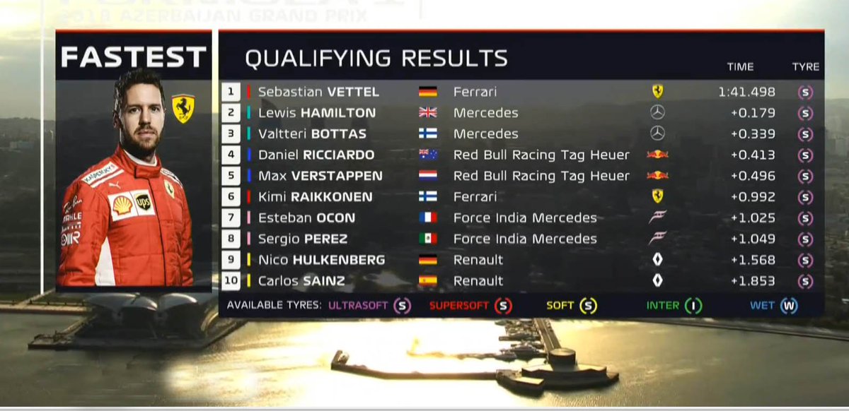 In prima fila con Seb ci sarà il grande rivale Lewis Hamilton, a bordo di una Mercedes che sembra piano piano riemergere dopo i distacchi abissali rimediati nelle prove di Shanghai. Solo 179 millesimi lo dividono infatti dalla Ferrari in pole, segno che domani per la vittoria ci sarà da fare i conti anche con il campione del mondo in carica. In seconda fila troviamo l’altra Mercedes di Bottas e la Red Bull di Ricciardo, che proprio sul finale ha battuto il compagno Verstappen relegandolo al quinto posto. Un errore all’ultima curva costringe Kimi Raikkonen ad accontentarsi della sesta posizione, davanti alle Force India e alle Renault che chiudono la top ten.