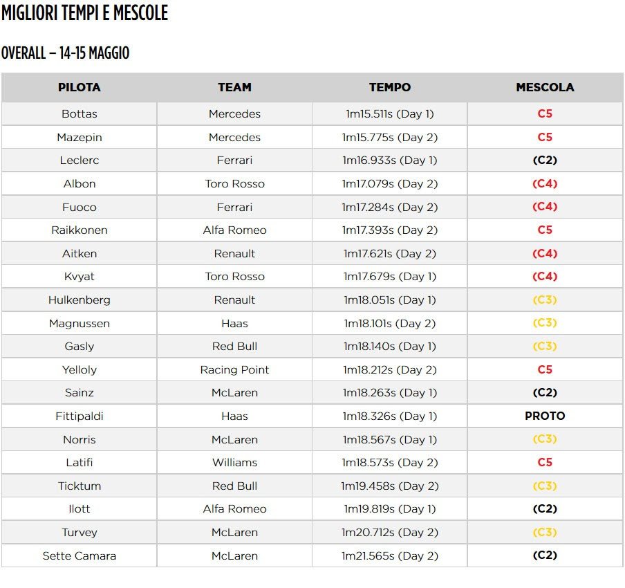 “Questi ultimi due giorni di test collettivi per la stagione 2019 sono stati particolarmente significativi. Continueremo a lavorare in ottica 2020, con i nostri test in programma fino a fine estate, mentre da settembre ci concentreremo esclusivamente sullo sviluppo dei nuovi pneumatici da 18” per il 2021. I Team hanno raccolto moltissimi dati, grazie anche alle condizioni meteo favorevoli, con temperature asfalto che hanno superato i 40° nelle sessioni pomeridiane. Come sempre nei test collettivi, i Team hanno avuto a disposizione l’intera gamma 2019. Alcuni hanno provato anche le mescole più morbide in vista delle prossime due gare a Monaco e in Canada, insieme agli ultimi aggiornamenti aerodinamici. Come da regolamento, i Team hanno alternato alla guida i piloti ufficiali ai giovani. Un ringraziamento particolare va a Ferrari e Racing Point, impegnate in questi due giorni con una seconda monoposto nei nostri test di sviluppo 2020. Trattandosi di test “blind”, Team e piloti non hanno ricevuto alcun tipo di indicazioni sulle soluzioni provate. Abbiamo raccolto molti dati utili in condizioni rappresentative che andremo ad analizzare nelle prossime settimane per definire le specifiche tecniche dei pneumatici 2020”.